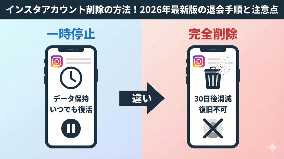 最大の違いは、「再度ログインするだけで、いつでも元の状態に戻れる」点です。写真もDMもそのまま残ります。多くのユーザーが、「削除して後悔した」という経験をしているため、迷いがある場合はまず一時停止を選び、30日ほど様子を見るのが2026年の賢い選択です。